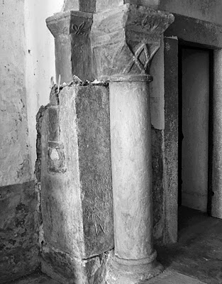 Mas o que particularmente lhe chamou à atenção foram umas letras parcialmente ocultas sob múltiplas camadas de cal, gravadas lateralmente numa das pedras que sustentam o arco da capela.